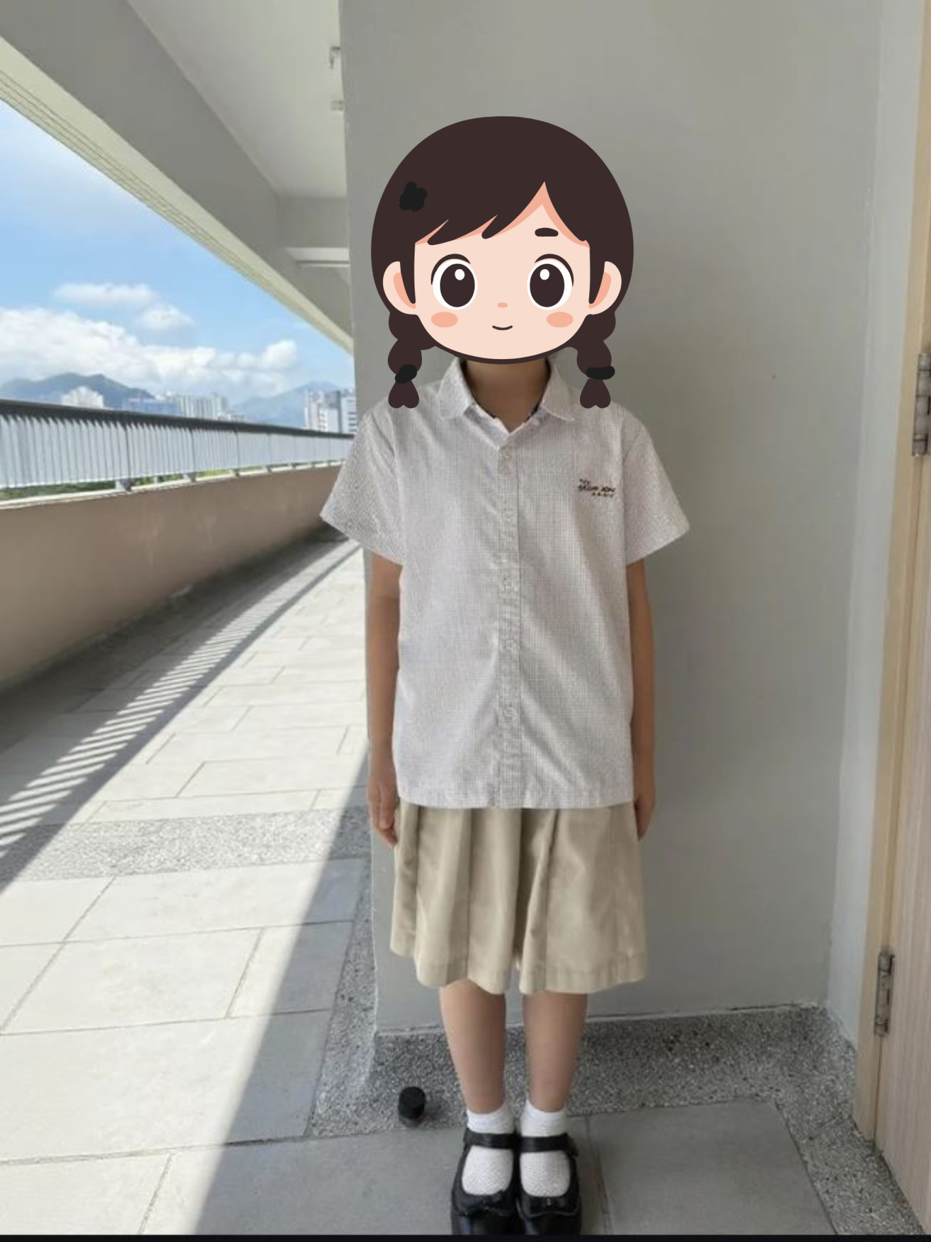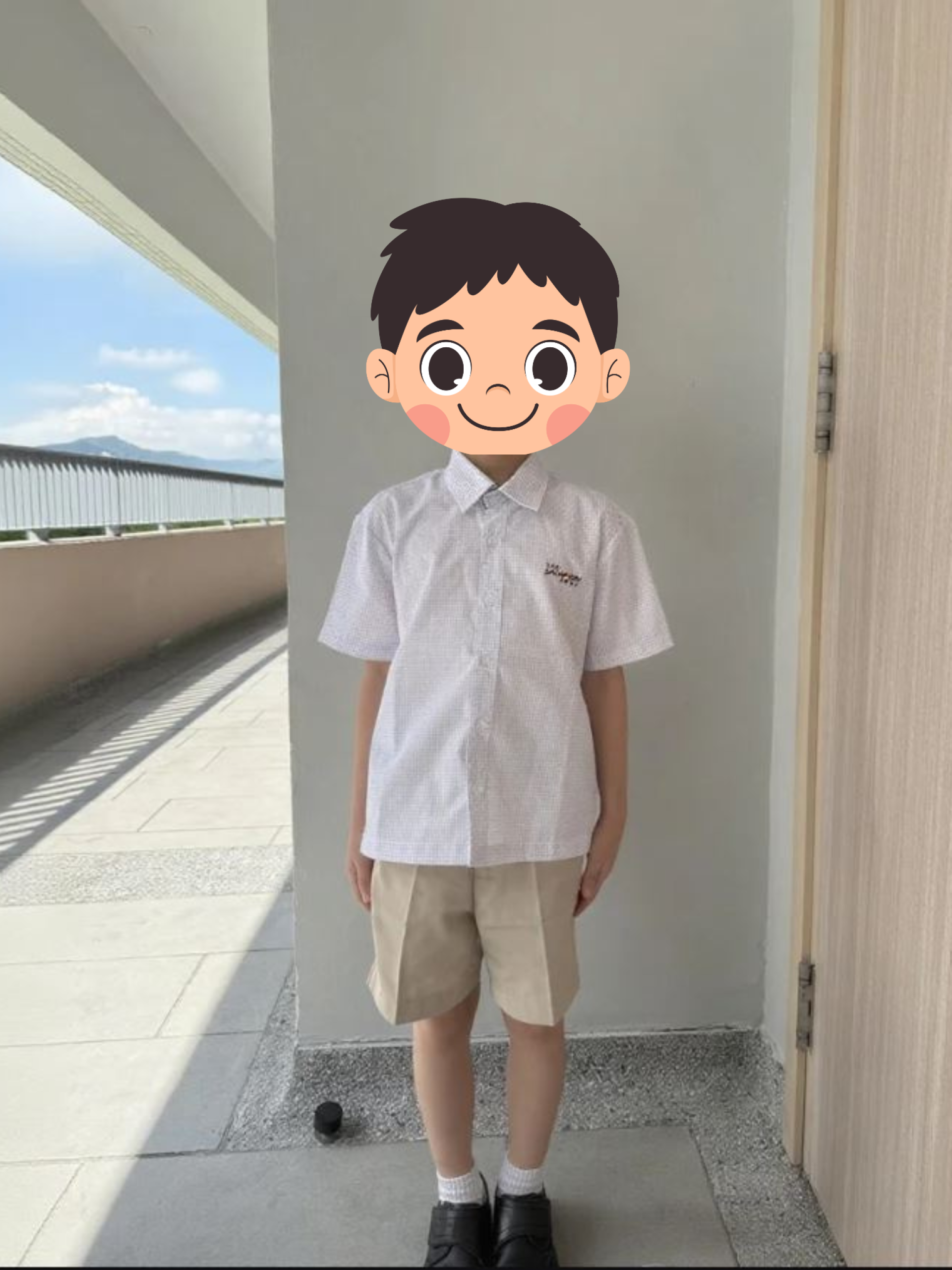 短袖格仔恤衫 杏色短西褲 純白色中筒襪 純黑色平底皮鞋(有魔術貼或綁帶) |