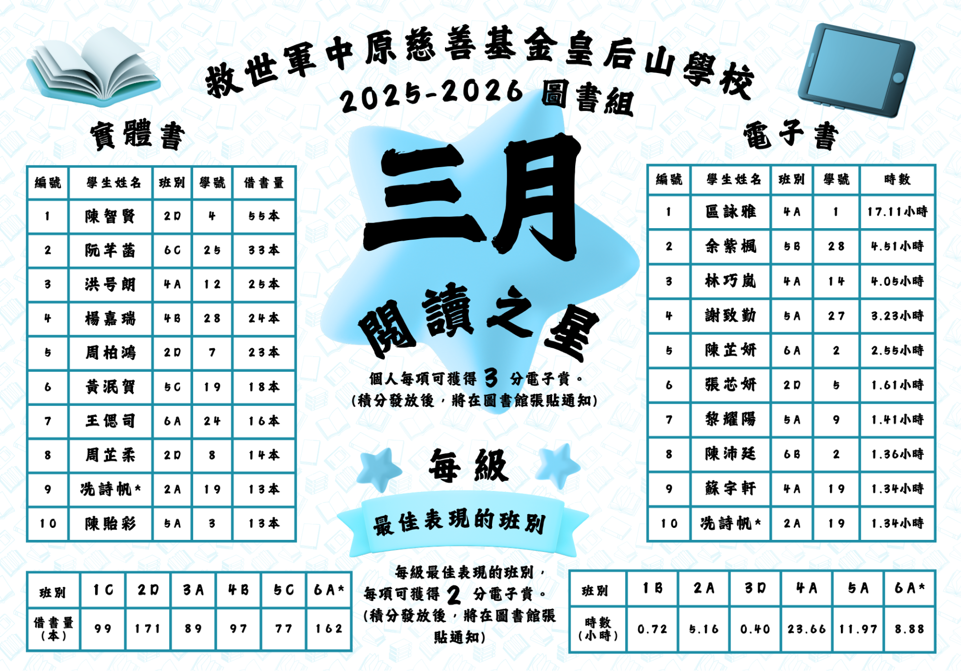 三月「閱讀之星」🌟正式公佈!欣賞同學能延續對閱讀的熱情。