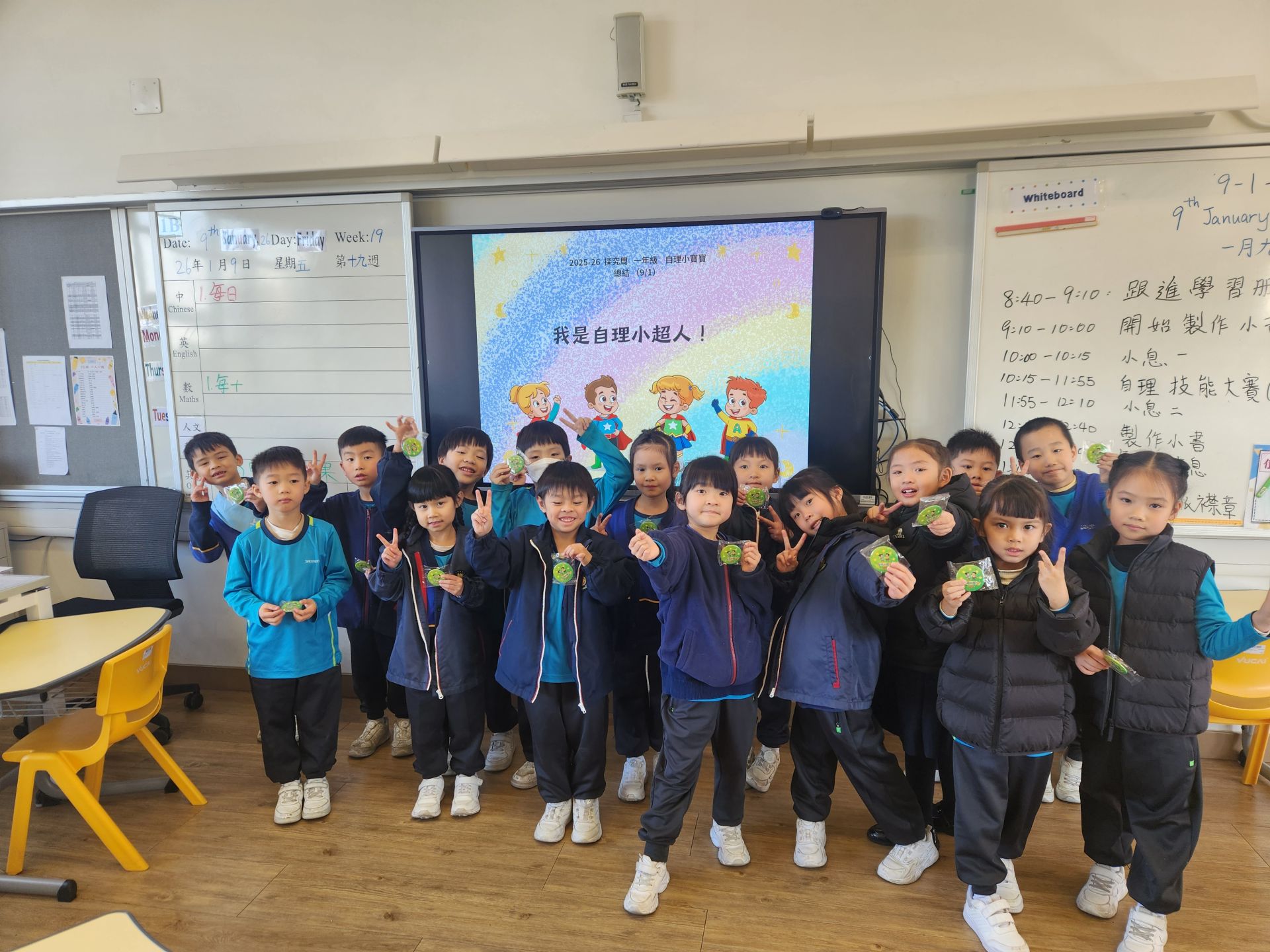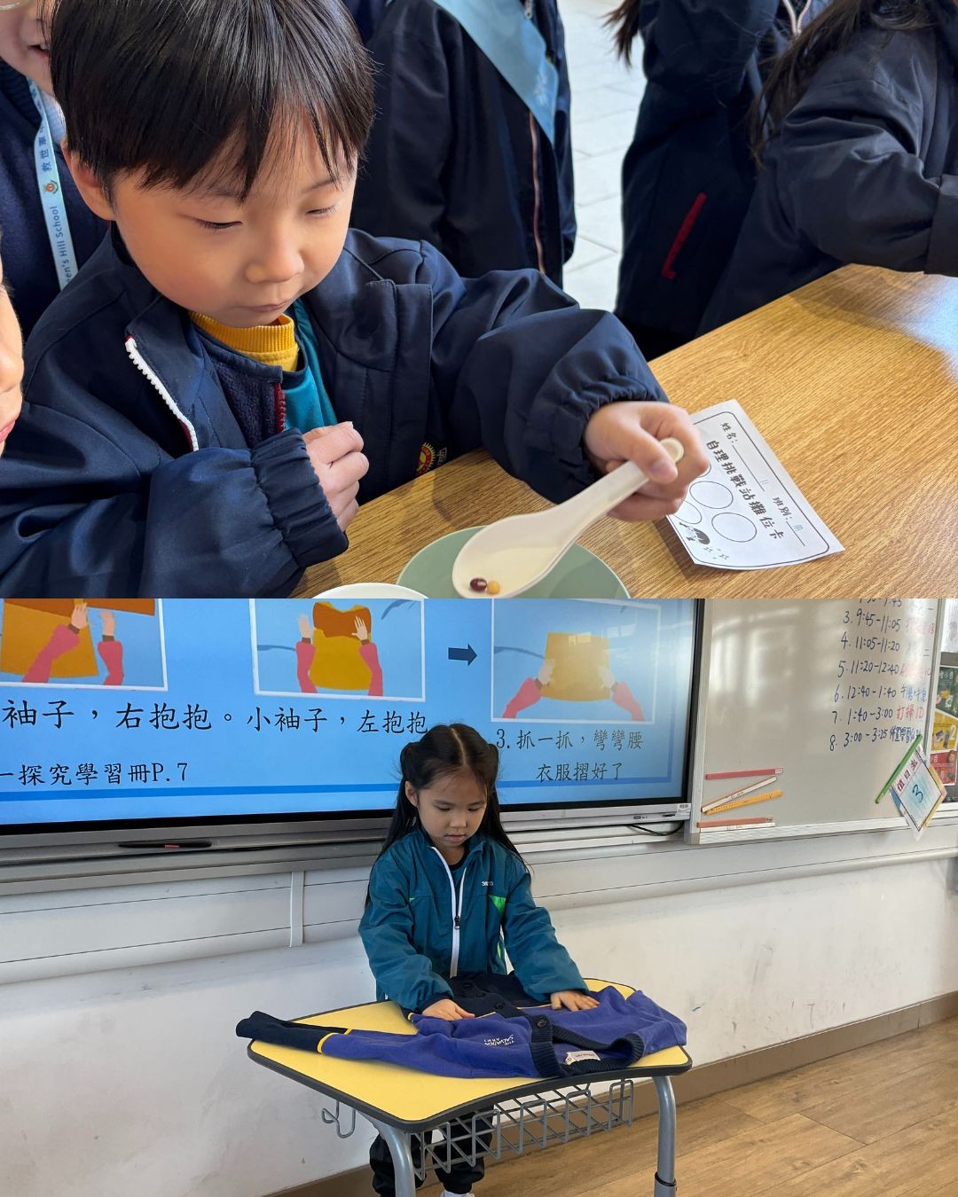 我們成為「自理小超人」了!一年級同學在三天的探究周中學習各項自理技能,包括洗手、洗臉刷牙、打掃、收拾書包和摺衣服,又在「自理挑戰站」中挑戰完成不同技能,如扣鈕、拉拉鍊、掛衣服、扭瓶蓋、使用湯匙,同學們都躍躍欲試!最後一天,他們在「自理技能大賽」中發揮所學,一展所「技」,讓老師見證如何由自理小寶寶化身為自理小超人,既是難得的學習經歷,又能培養同學自理的能力呢!