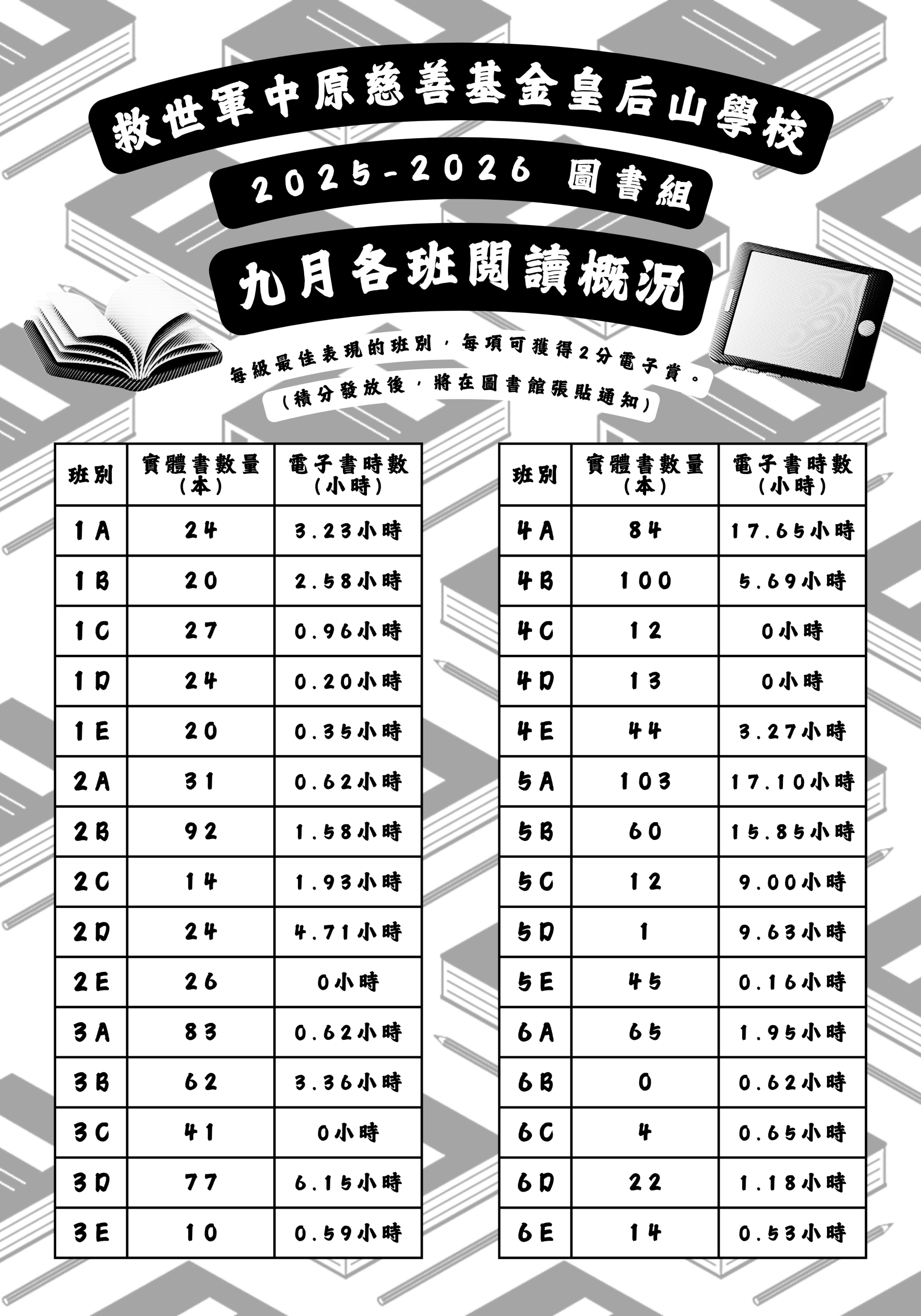 圖書館每月恆常舉辦「閱讀之星獎勵計劃」,設有「個人獎項」和「每級最佳班別獎項」。實體書及電子書各自首十位閱讀量最多的同學可獲得一張「閱悅通」,享有不同的閱讀福利。同時,配合訓輔組的電子獎勵計劃,個人可獲得3分,勝出的班別則可獲得2分,以鼓勵同學多多閱讀。